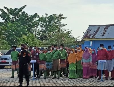 Babinsa Memakai Topeng Spiderman Menarik Minat Siswa Dalam Acara Vaksinasi